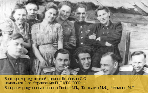 Во втором ряду второй справа Щербаков С.О. - начальник 2-го Управления ГЦП МВС СССР. В первом ряду слева направо Глоба И.П,, Желтухин М.Ф, Чичиянц М.П"