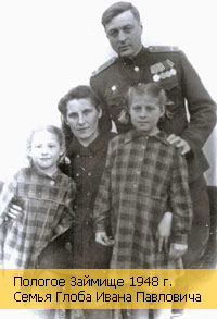 Пологое Займище 1948 г. Семья Глоа Ивана ПавловичаВо время службы на полигоне папа в 1955 году заочно окончил Военную Воздушную Академию. Он был очень ответственным человеком и серьезно относился к своей работе. Часто отправлялся на испытания на полигон в Капустин Яр. Когда он надевал полевую форму, мы уже догадывались, что он едет в поле (на испытания, как мы сейчас понимаем, новой авиационной техники).